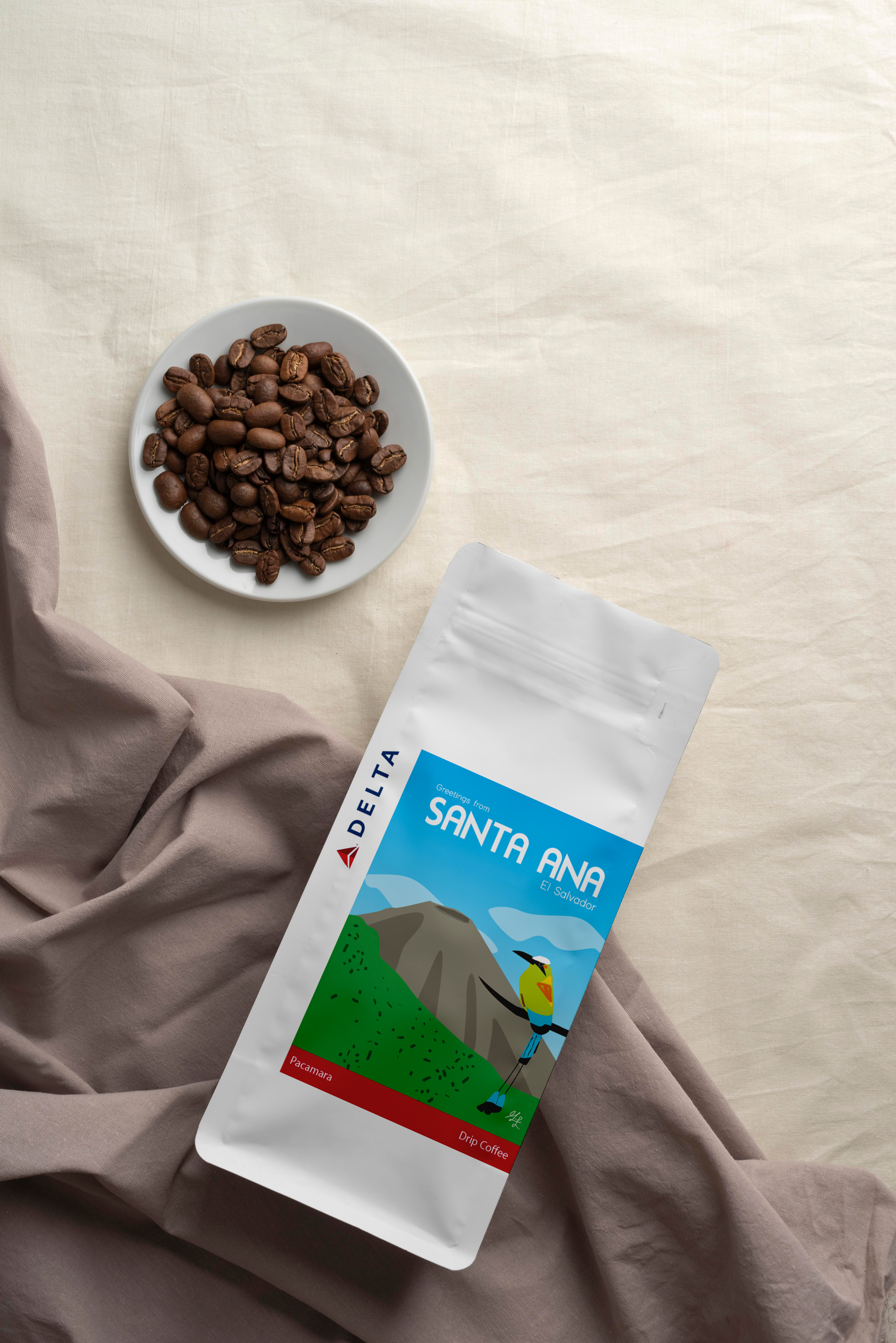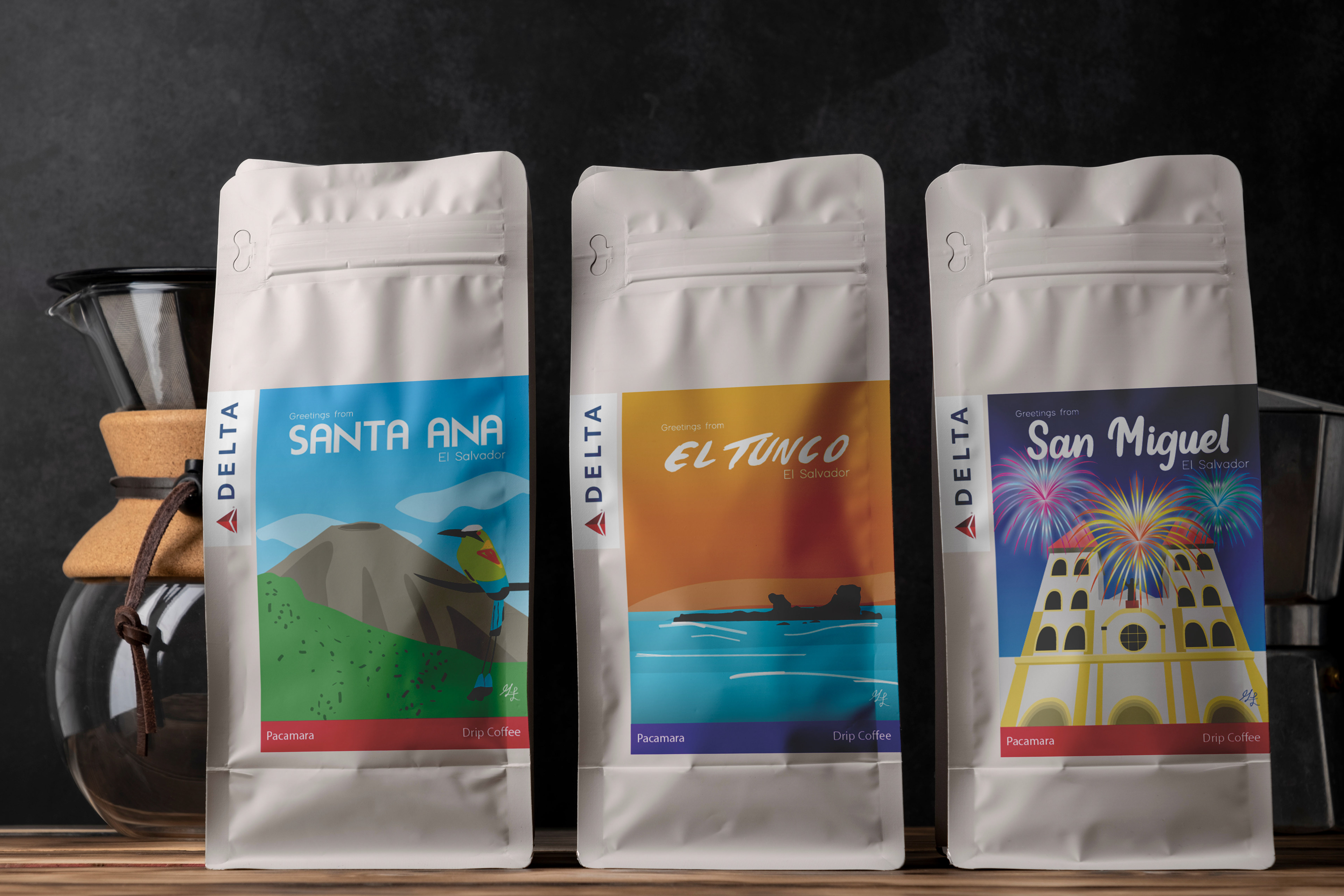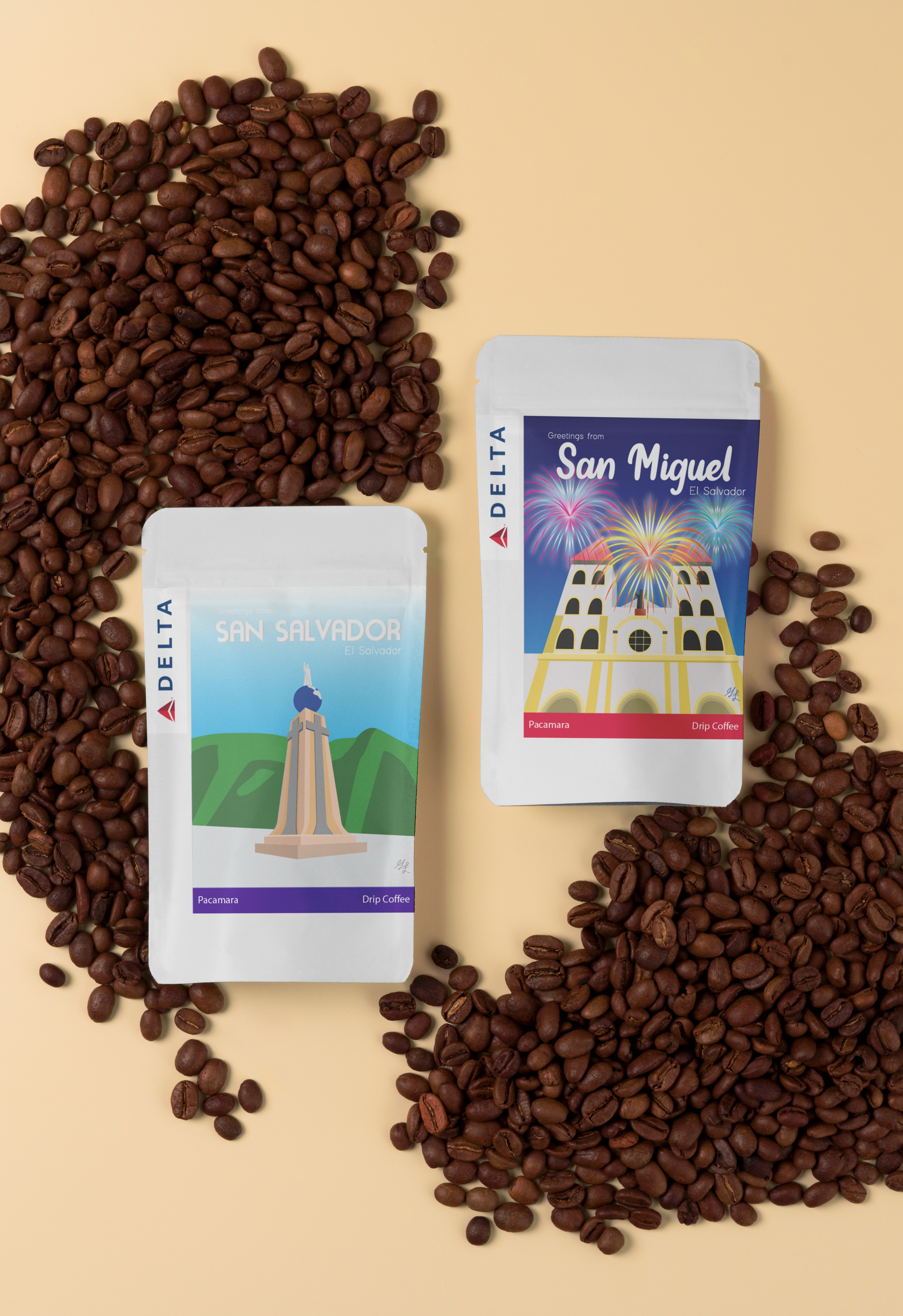 In collaboration with Delta Airlines – El Salvador Station, Larios Studio was commissioned to create a set of postcard-style illustrations for a limited edition coffee gift. To celebrate El Salvador’s Independence Day on September 15, Delta gifted bags of Salvadoran coffee to their premium passengers, featuring custom packaging designed for the occasion.